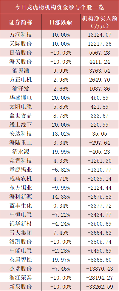 盘后龙虎榜数据显示,机构现身多股,其中万润科技等股票呈现机构资金净买入,新泉股份等股票呈现机构资金净卖出。